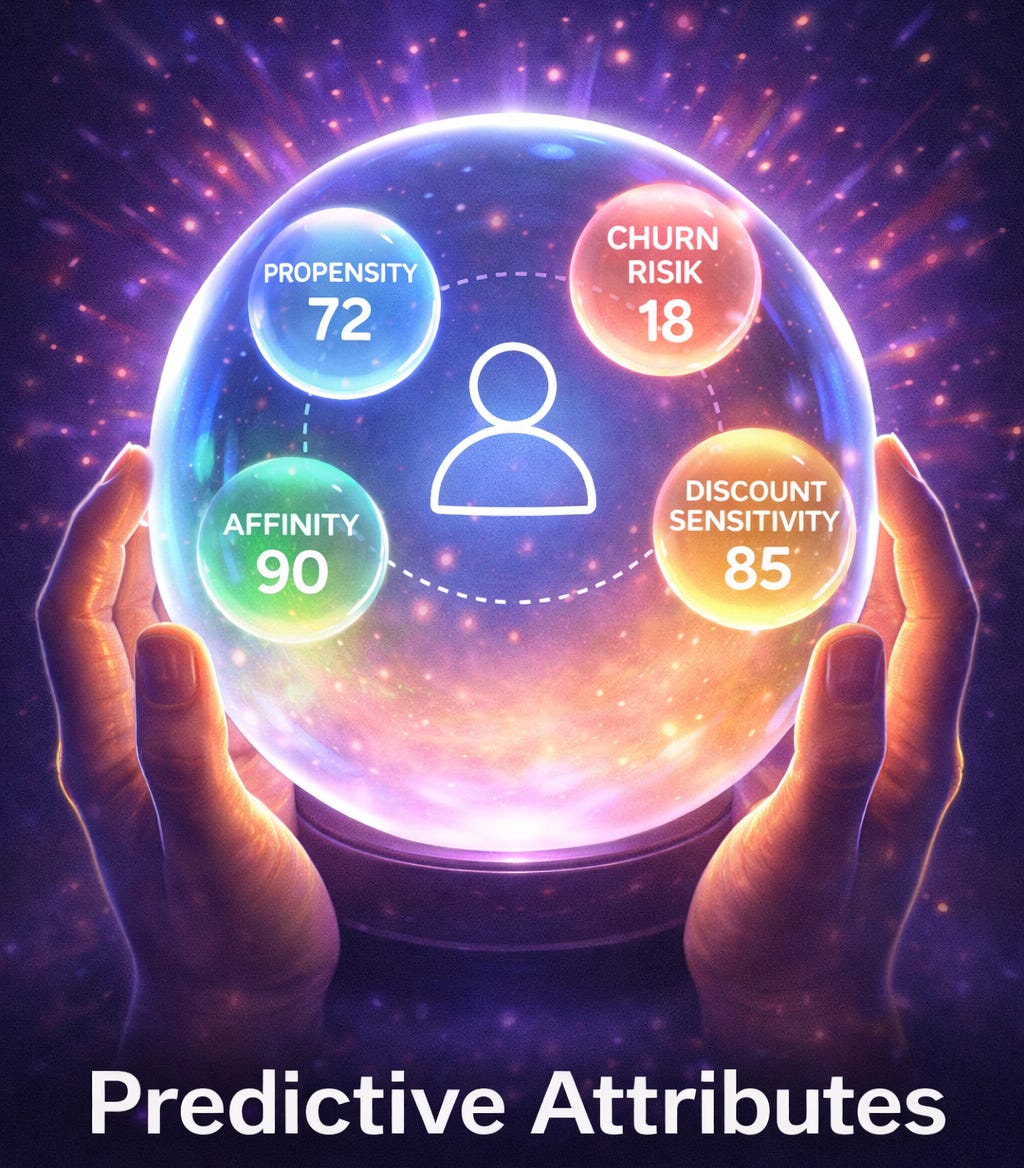 Bài viết này trình bày khái niệm Predictive Attributes, phân loại các nhóm điểm số phổ biến như propensity, discount sensitivity, affinity, vai trò của chúng trong cá nhân hóa hiện đại, và cách các hệ thống dữ liệu khách hàng sử dụng điểm số làm nền tảng cho automation, recommendation và AI-driven decisioning.
